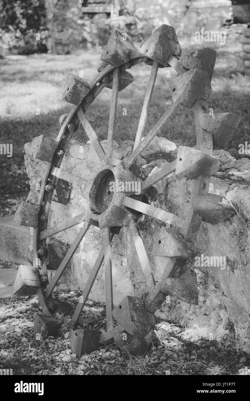 An iron wheel, or metal cage for tractor used in agriculture, draws a half circumference on a typical steel tractor wheels. A pair of antique steel wheels from an old tractor, decorating the gate through an old stone fence to a rock house.